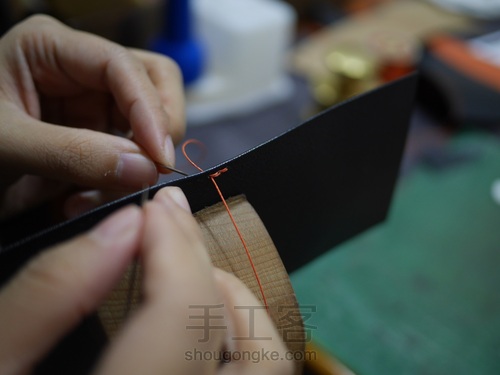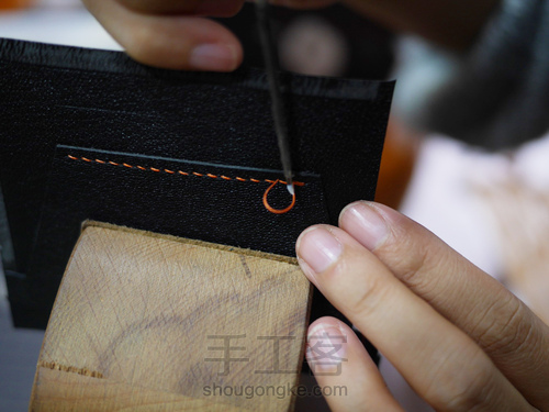 打斩后对卡位底部进行缝线,由于我们使用的是山羊皮,缝线的力度也要保持均匀,这样子才能够缝出美观又工作的线迹。