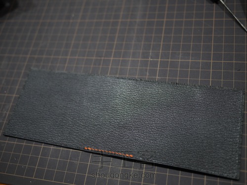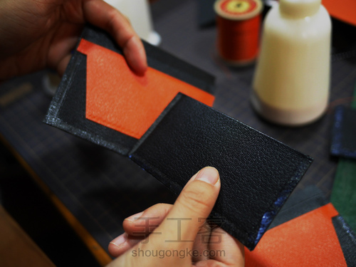 整个短夹缝线过后,我们使用裁皮刀把短夹外皮的4个直角裁切成圆角。并且用黑色边油进行边缘处理。