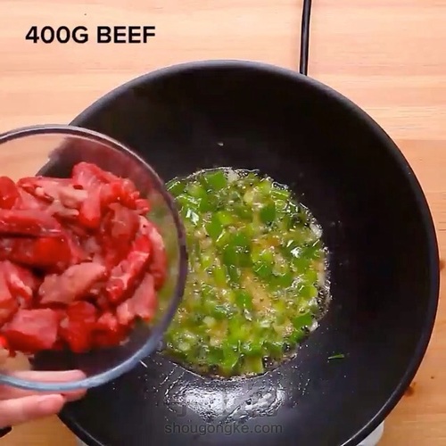 放入切成条的牛肉