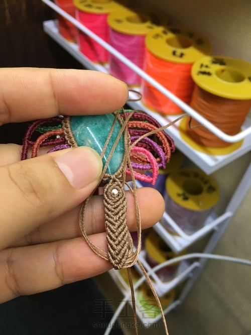 绕道背后,用最中间两根线,勾住有编结的地方,