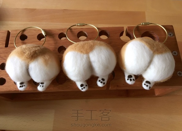 用中针在顶部戳制一个小孔,用胶水涂抹羊角钉后插入小孔,等一会胶水干后穿上钥匙环,可爱的小柯基钥匙扣做好啦!