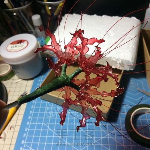 花芯每朵花准备6根18cm左右红色铁丝(每根顶端在造花液里过一下