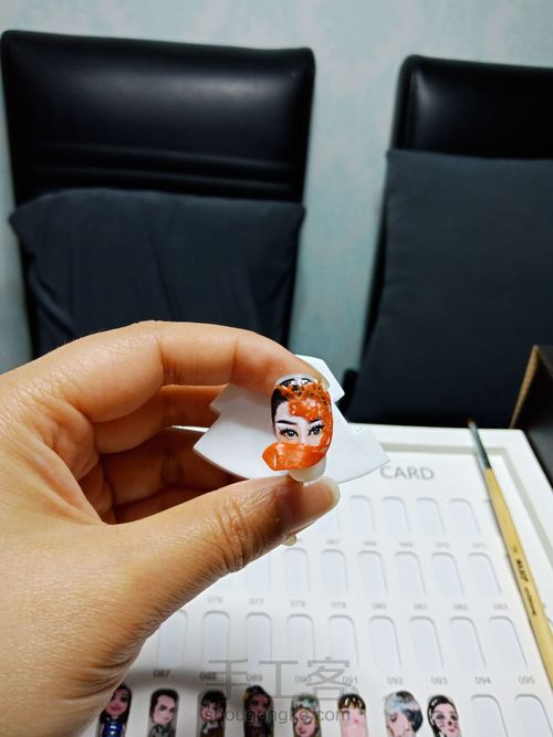 这个脸部红色属于剪纸艺术,面积太小,所以我用纸托加光疗胶透色,按原图剪纸的形状铺底,再用红色画出剪纸的形状,画和底部的鱼,照干,从纸托上揭下来,处理边缘