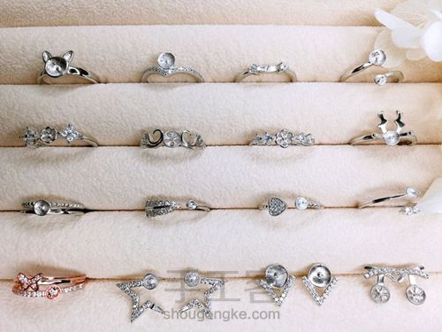 在戒指托和耳钉托的针上涂上少许胶水,再将其插入珍珠孔即可,静置一天左右就完全牢固。图片为成品效果展示。