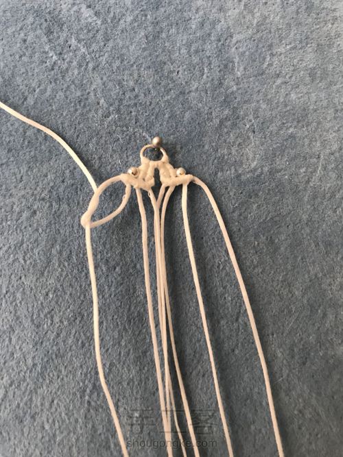 刚才做斜卷结的两根线,做一左一右的云雀结,我这里做了6组半,具体看你喜欢什么造型,线粗细也会导致结数也不同,自己掂量嘿嘿