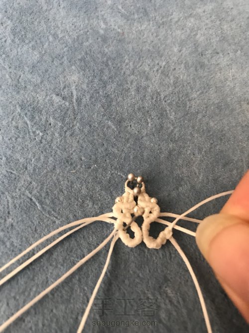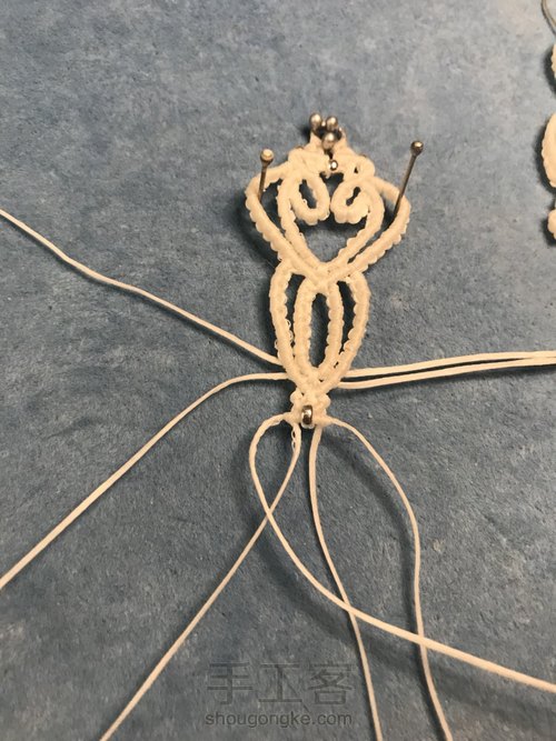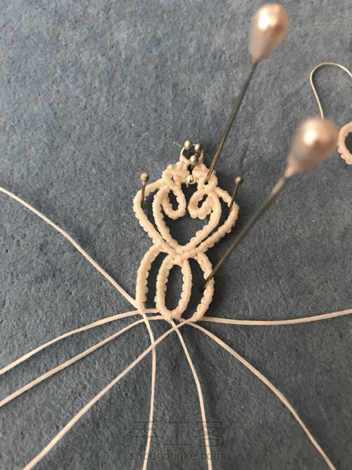 外面的线要比里面多打几个云雀结。孤独可以用珠针帮助固定出来。