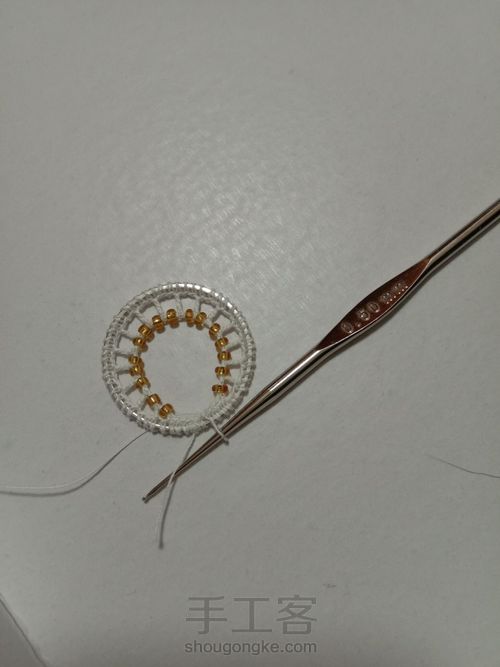 第二圈长针并穿上珠子,第三圈中长针收尾