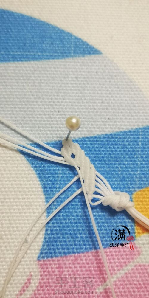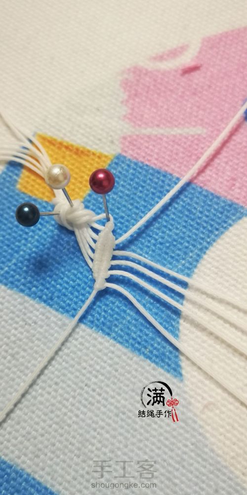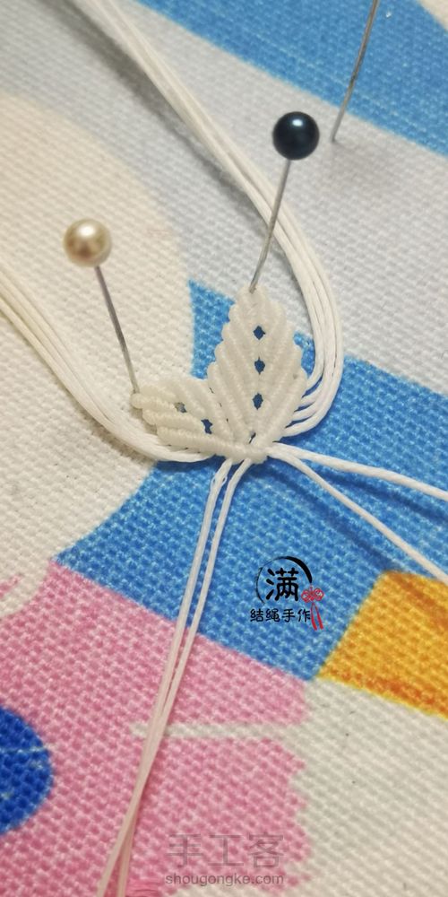 另外,编到留下三根线时,插定位珠针,这会开始编另一半。第5步: