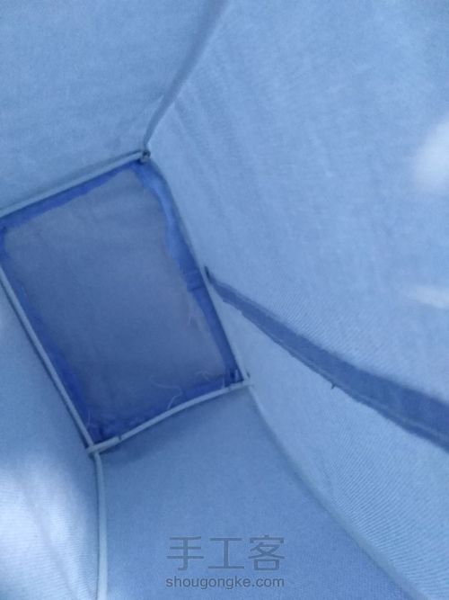 减掉袖口,从袖口处往里大约二十厘米减下,计算周长减下差不多尺寸的方形,缝在一侧封底,袖口连接处我缝在了一侧的中间这样不会影响美观,将支撑架撑在缝好的布兜里。第3步: