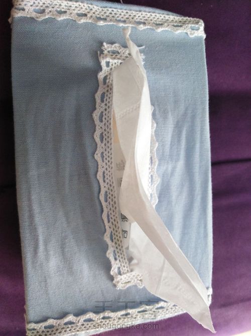 在正面中间找位置划出取纸口,取同样长度两段花边缝上,花边两侧加一小点封边,我后面这些就使用胶枪了,反倒增加硬度,让抽纸口不至于太松垮