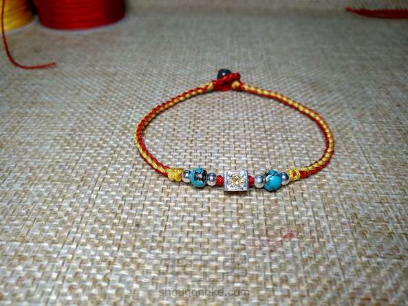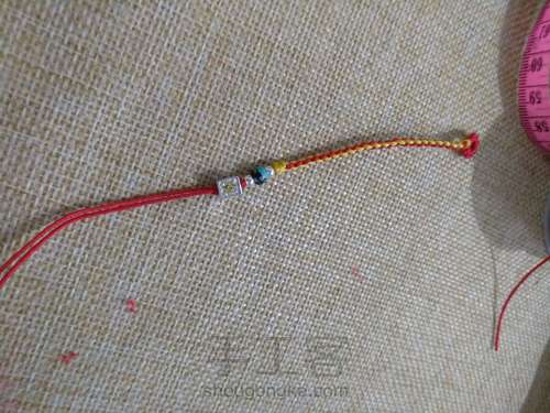 用红玉线在黄玉线上打8个雀头节,然后打两个蛇结,接着开始编四辫节,达到长度打两个蛇结固定
