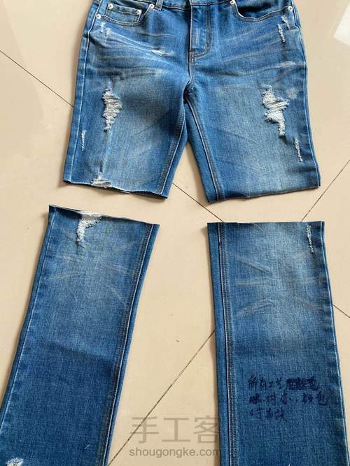 大概从裤子膝盖的位置剪掉,只用膝盖下面的布料。