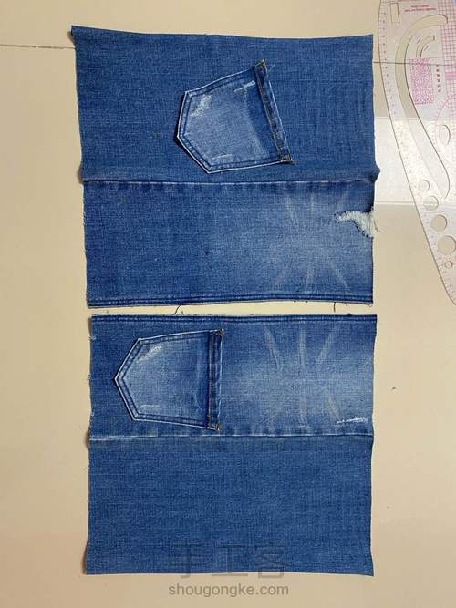 把原来牛仔裤的裤兜拆下来做装饰。