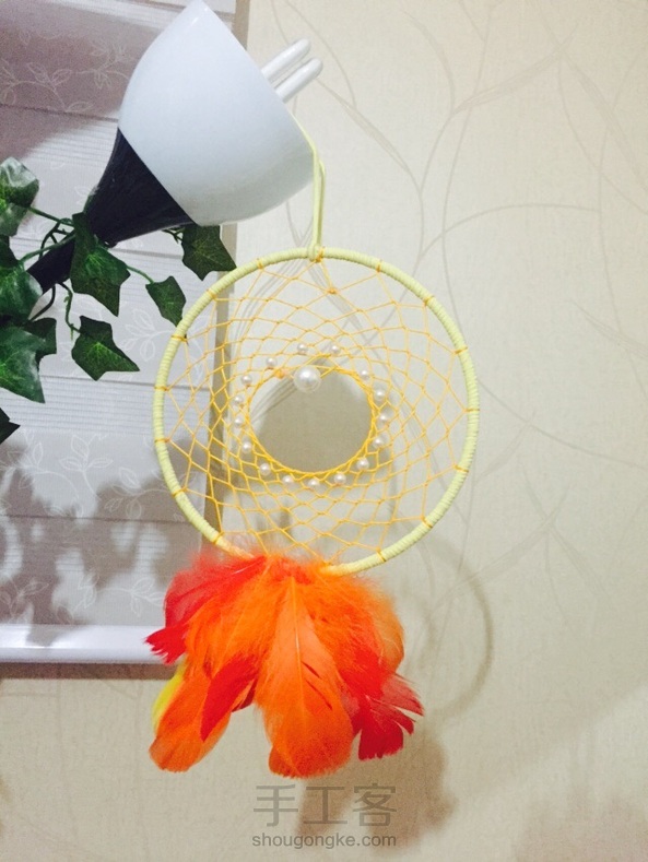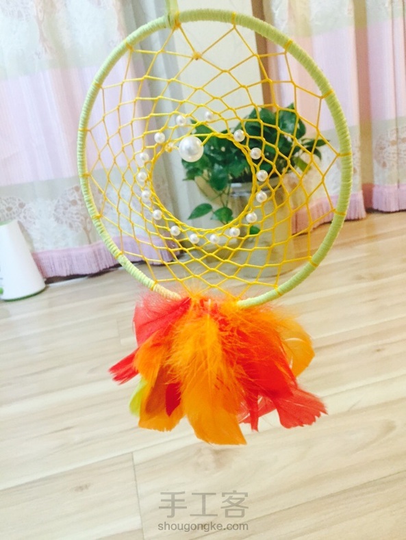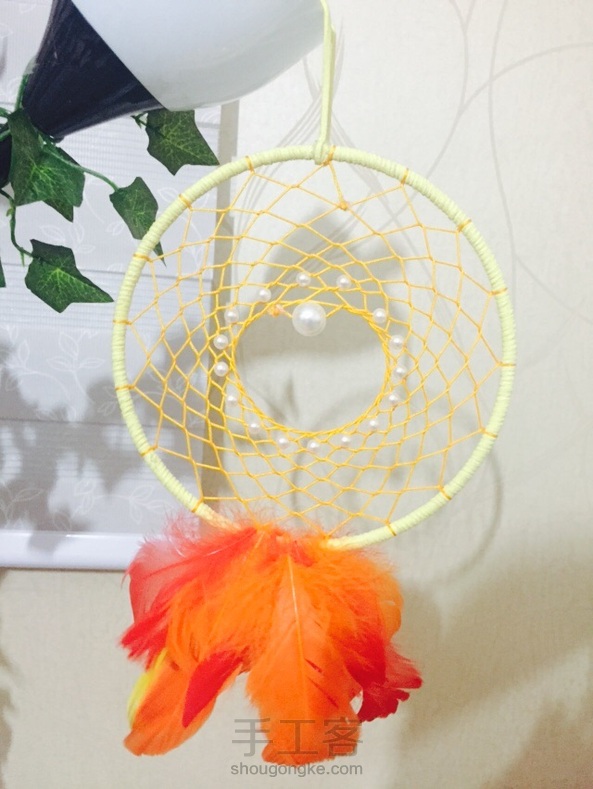 捕梦网。9th,取名夕阳。没有达到想象中的效果。原本是用线串着羽毛的,但是稀稀疏疏,而且飘荡的感觉没有黄昏安宁的感觉,干脆剪下来,直接将羽毛粘在梦网圈上。羽毛粘得有点凌乱,线圈与网的颜色搭配也不太满意,不知道红色的线圈会不会好一点。不过,也算自己的一个小创意啦~~