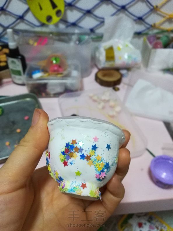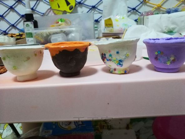 和孩子用果冻壳做的碗,有三个里面没有用粘土包,还没想好装啥。本来我想把白色的画青花瓷,可是小家伙自告奋勇要装饰。这碗真是花啊