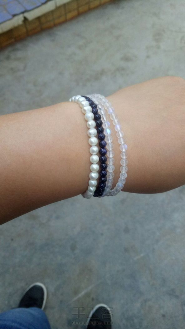 为客户DIY的手链!客户要求不加任何镀金镀银的金属配饰,以免退镀失色,故全用玉线编织!珍珠+紫金沙石+月光石,美美哒!优雅秀气!
