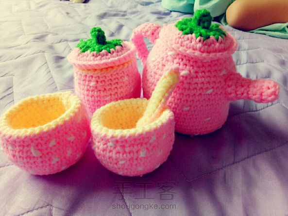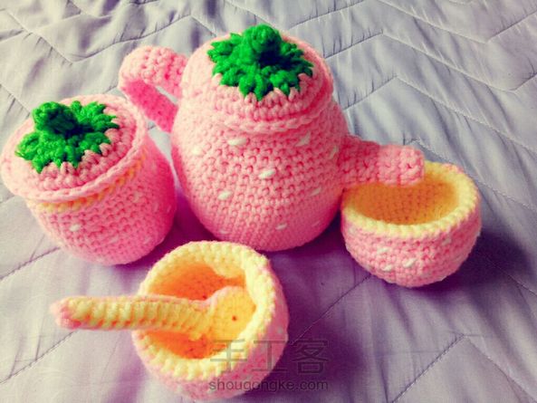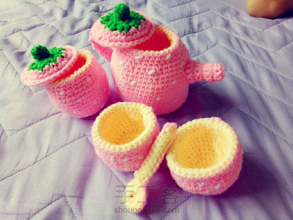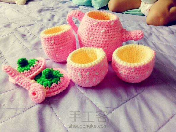 趁我女儿这两天睡午觉的时间钩了一套茶具,这套在孕期就钩过,线材不满意,换了毛线重新钩的,颜色有没有粉嫩粉嫩的感觉?