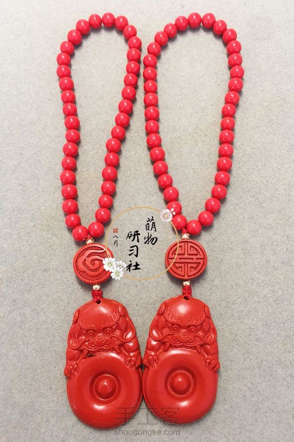 瑞兽们虽然各有职责所在,但第一要务还是护主辟邪。朱砂自古也是辟邪的好物。所以这几款车挂/包挂的设计全部采用高含量朱砂,配18K小金珠和翡翠小环环。加上金刚结、平安结的绳结方法。应对农历七月这个阴气还蛮重的月份,是再妥善不过的了