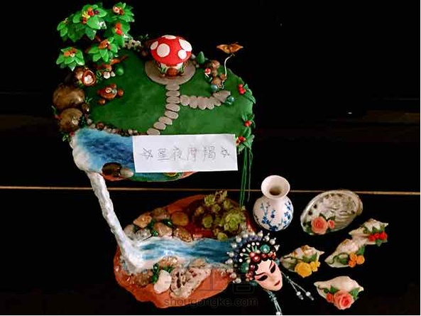 #全民手动嘉年华# 这几个是我自己比较喜欢的作品。 纸粘土雕塑“独角兽”。软陶加粘土“悬浮岛”。纸粘土“青花瓷”。纸粘土加串珠“花旦脸谱胸针”。贝壳加冷陶瓷玫瑰花。