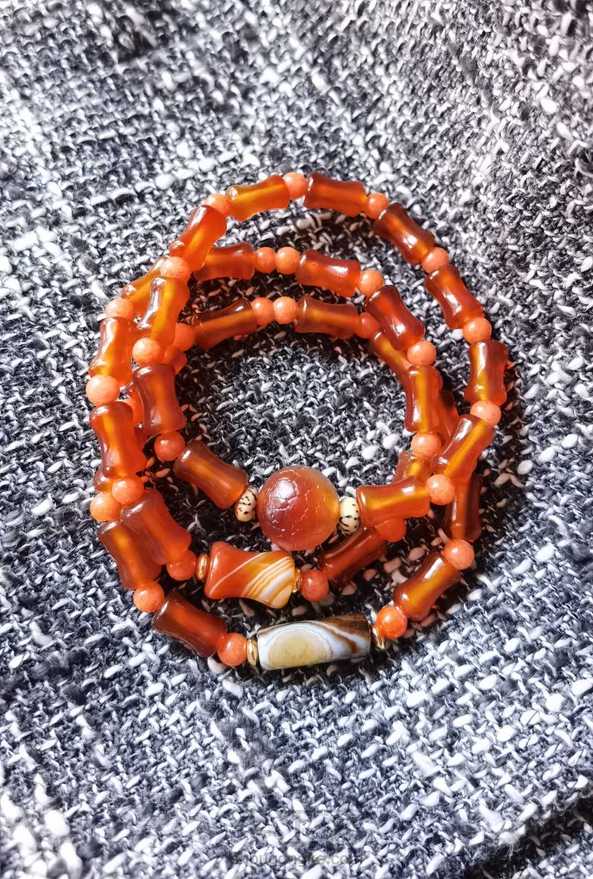 红玛瑙竹节、金丝红玉、龙鳞玛瑙、菩提做了3条手串。
