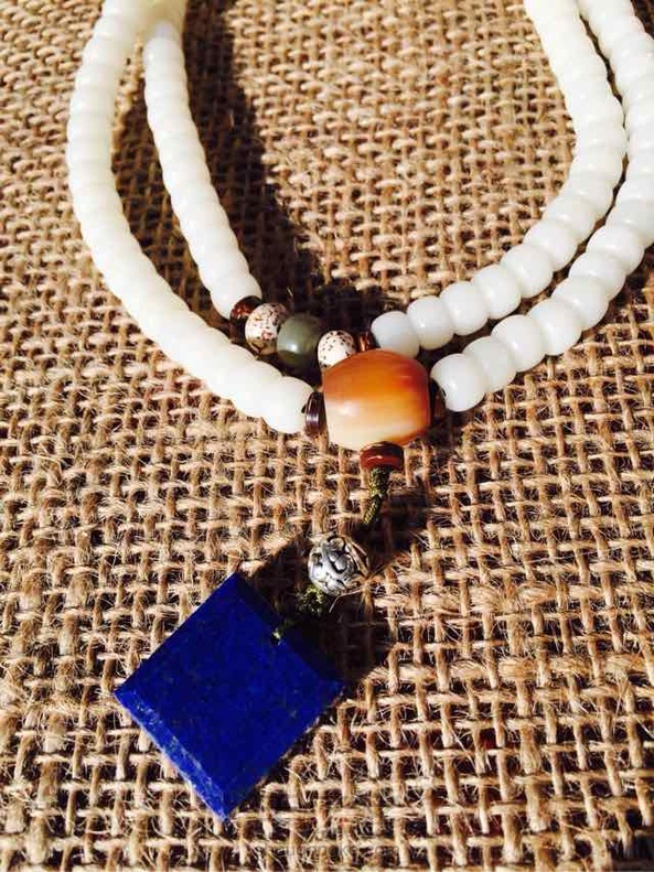 还是青金石做吊坠的系列 相比青金石桶珠 最近开始疯狂喜欢上无事牌系列 这款无事牌也是超级爱的有木有 主珠 白色的是86mm桶珠白菩提根108颗 隔珠 用了星月86mm苹果珠 还有极品阴皮96mm桶珠 三通是牛骨咯 吊坠是重点 青金石无事牌 很赞 不早了 发完碎叫咯 安