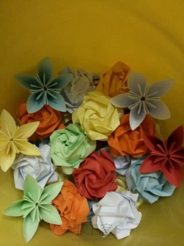 考拉:川崎玫瑰,教程很多。樱花是分别折好五个花瓣再粘到一起的,继续把花朵粘起来,还能粘成花球
