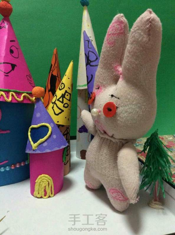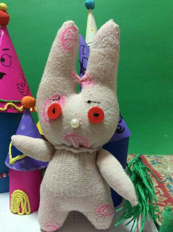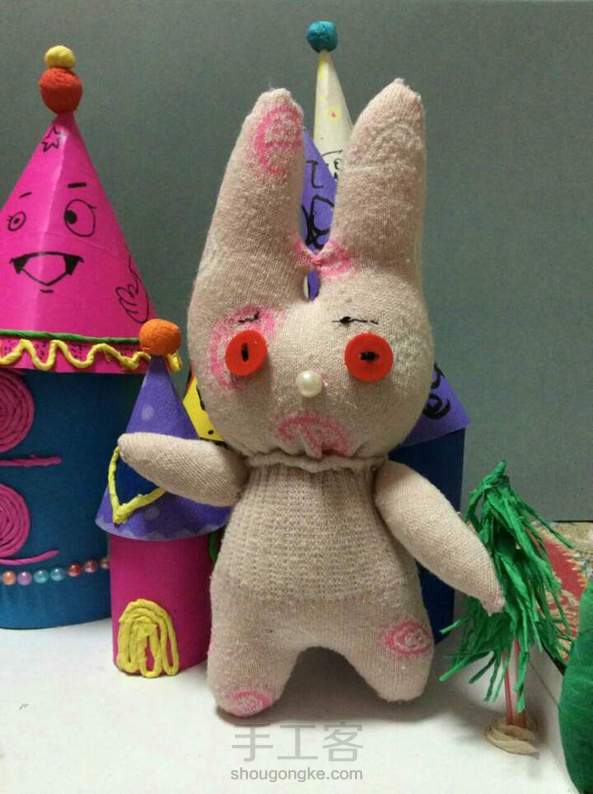 为儿子做的兔子,第一次做这种袜子娃娃,虽然不精致但是儿子喜欢就好啊,还没想好怎么给它做衣服,先露露脸,有知道的请赐教噢