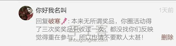 这几天这是怎么了 安安静静的玩手工不好么 没理还要搅三分也真是够了 再说了 自己说的话自己不认 您是精分还是失忆啊……图1是你好我名叫同学与我的私信 图2 3是你在圈子里的留言 不过也对 这不是指责已经是在骂人了 图4 你在私信里说 因为不及时所以没去领 那难道你还要来找我反应么
