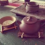 还没有整理的背景乱七八糟不能出镜,只能从很奇怪的角度来拍了,桌旗的颜色比较满意,有怀旧的味道,路边捡了和陶罐插了几支假的小向日葵,已经没有别的搭配道具了,凑合看看,牺牲了小茶桌成就了它,所以一个人的茶具先摆放在这,总比散在地上强吧!