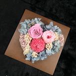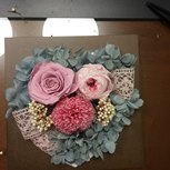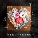 #永生花艺术拼贴画相框# 看了老师录制的视频,在自己脑子里就想着要做成心形的,怕刚开始摆放不出心形,所以就先把花全部处理好,自己在纸上画了个爱心,剪下来,再把处理好的花放在上面,就摆出图一的效果,还蛮理想的,在后续粘贴的过程中,慢慢设计摆放,最终效果还是可以