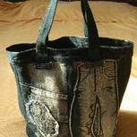 旧牛仔裤改的包,把裤子前后片拆下来,组合。裤子有自带的后兜,当包的后面。裤腰做的包口。