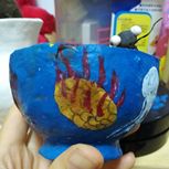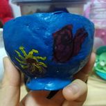 和孩子一起用纸粘土做的碗,我想画成青花瓷,她坚持要画成史前海底世界。看我俩画的威瓦西虫,怪诞虫,鹦鹉螺,海葵和水母吧,两个画渣