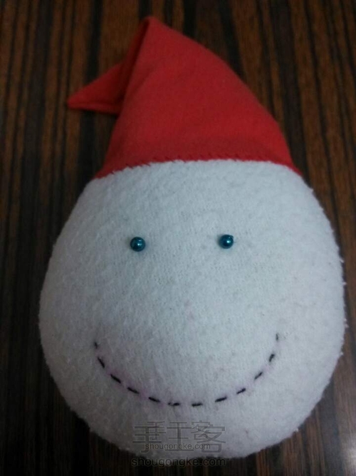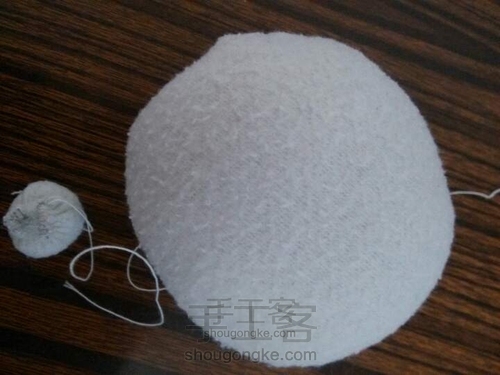 帽子上的白色小球,如图缝好塞入填充棉收紧,小雪人的头也按此方法做好。