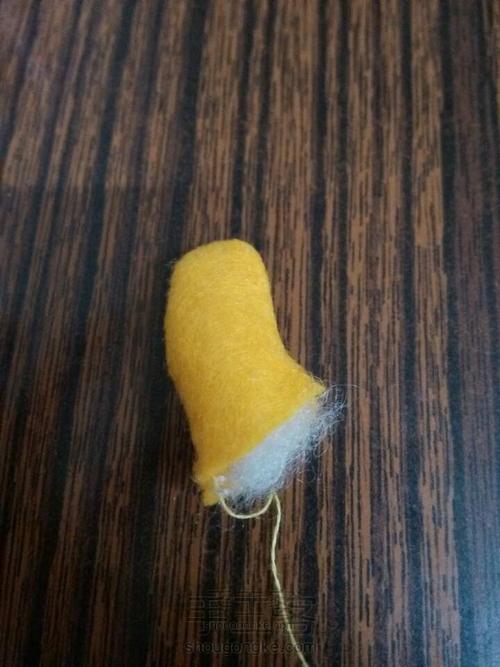 帽子沿直线边缝合,塞入少量填充棉,以便帽子能撑起来且尖垂下来比较有感觉。