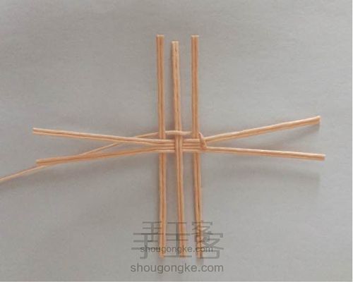 剪4股11cm长纸藤1根,2股9cm长纸藤3根,按图示粘贴好。正中间为两根的中点对粘,并排的竖向三根两两间距为0.5cm。