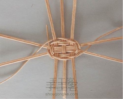 按图示绕半圈,插入第2根90cm长纸藤,插入的端头留一小段,不用太长(图示中长了点需剪短)后面绕线的时候可以藏进去。