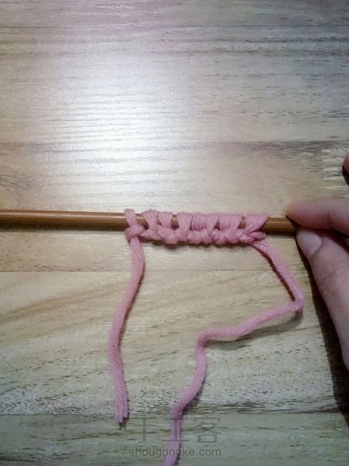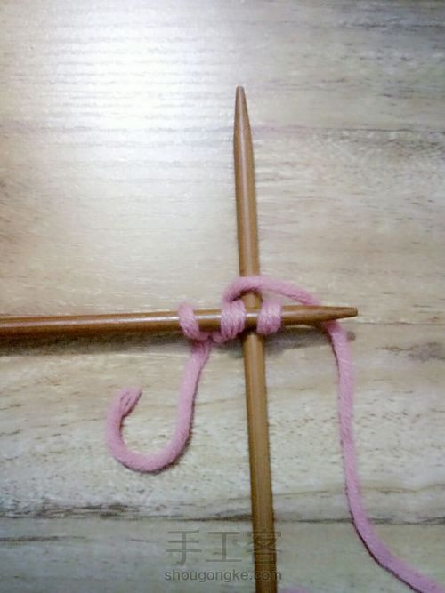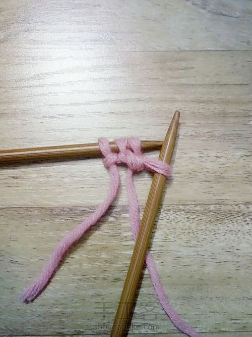 如图,左棒针挑起毛线,让线穿过洞,拉紧