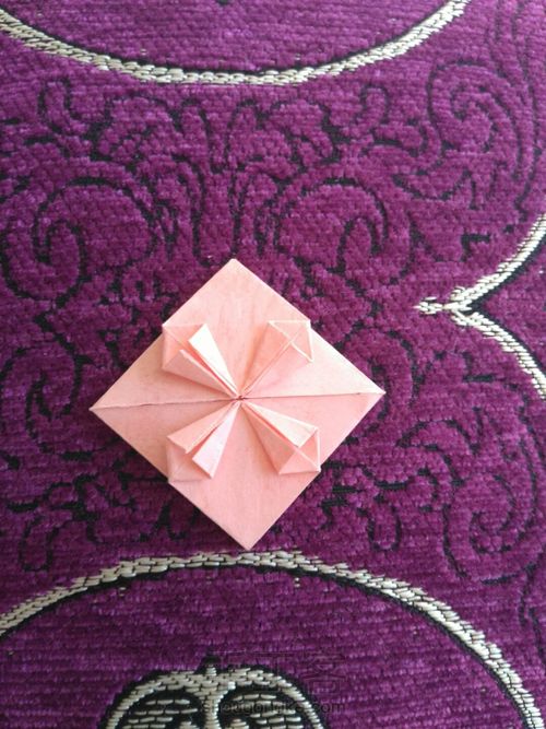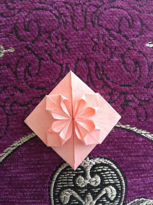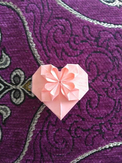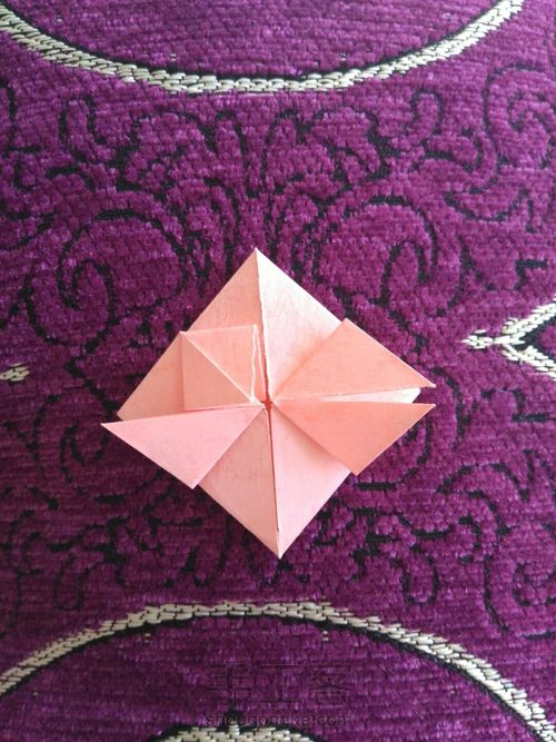 把上图上面的那个角向后折(注意,是不连着花瓣的角)折到什么程度呢,就是能看出来心的轮廓就好,随自己喜欢