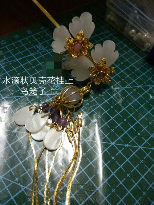 贝壳花片穿上小紫玉珠挂到鸟笼子上