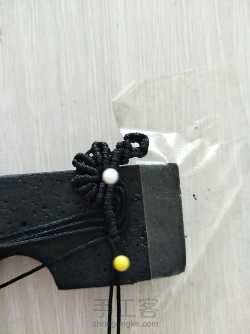 没有现成的花边,只能自己用线编一个。正好当天看到一个斜卷结的手绳,改了一下正好可以用作花边。