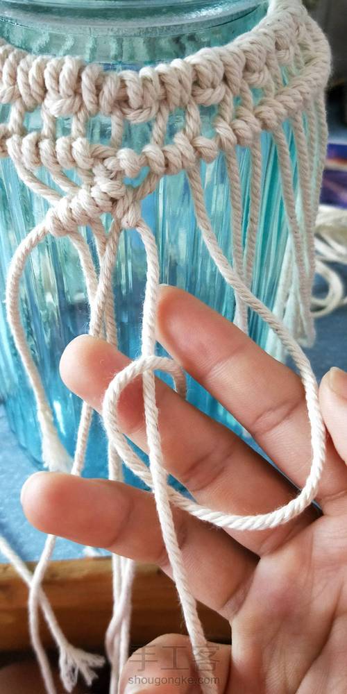 这里编到最后,收尾相接。调整整体宽松度。计算好绳子的数量,不要编到最后发现自己的绳子不够或有多余