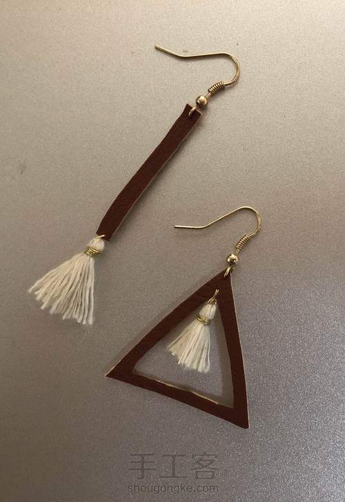 1.取皮质三角形、长方形。将它们分别串在耳坠上。