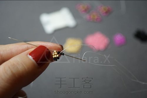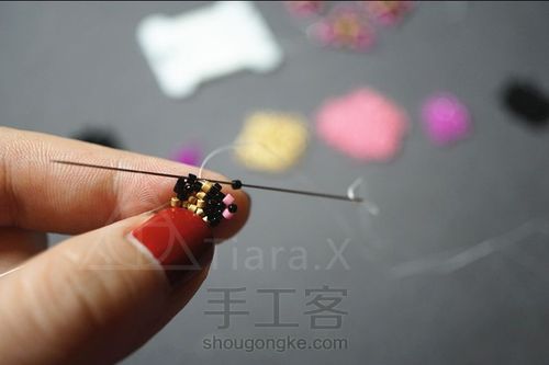 第二圈最后一步,加完珠子后穿过两颗金色珠子