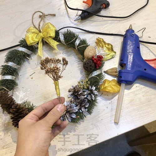 找到自己喜欢的装饰物,在松圈上摆放搭配。