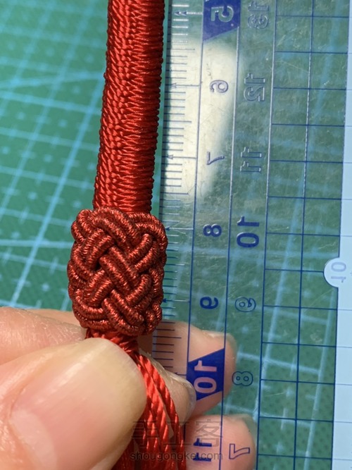 菠萝结的中心,要在手绳8.5cm的位置,连带手绳和菠萝结一起推紧