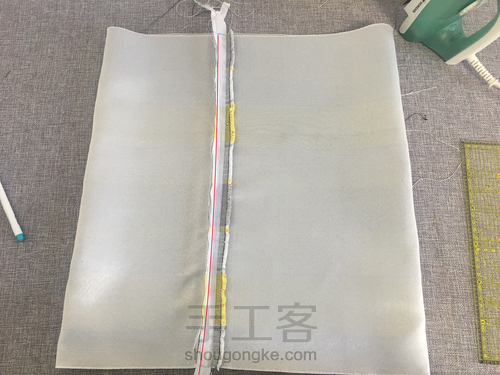 布料的另一端,向上折2㎝左右,也用熨斗烫平整。拉链另一侧和这一端的布料缝合。(如图红线位置)
