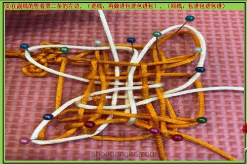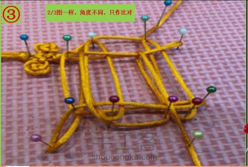:结束,收线,收线时先收出中间的菱形盘结,再收几个耳朵,副线最后一个花瓣用两个尾线剪断烧至,连接主线下面双联结,酢浆草结,双联结,装穗子完工。