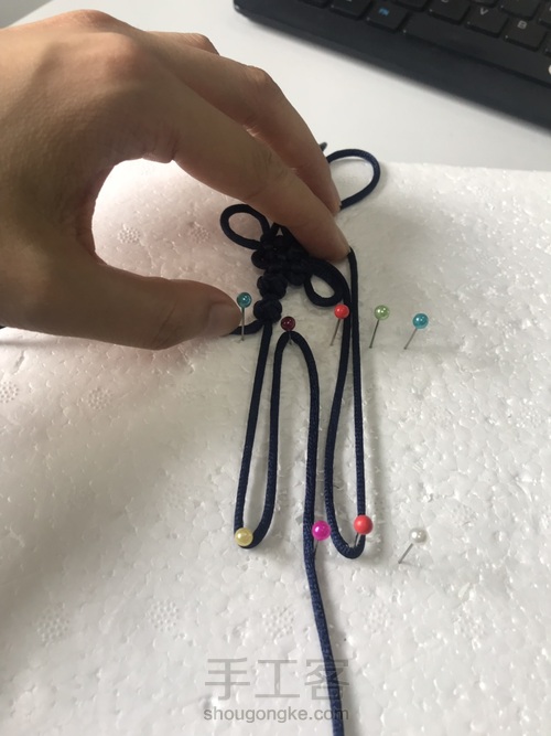 横向的进线出线是普通盘长结的做法,但只做两个来回,因为全做完不方便加另一个耳朵
