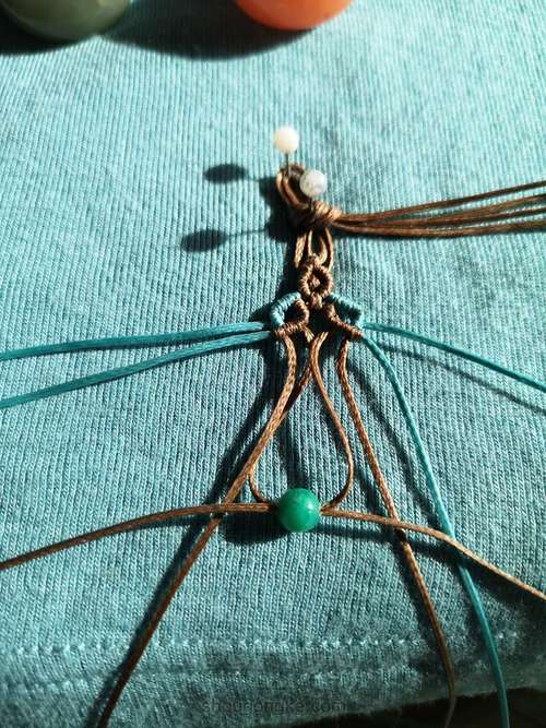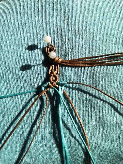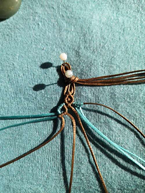 掉个方向,包白色珠子的两根做反斜卷结的线做轴线,下面两根咖线做绕线