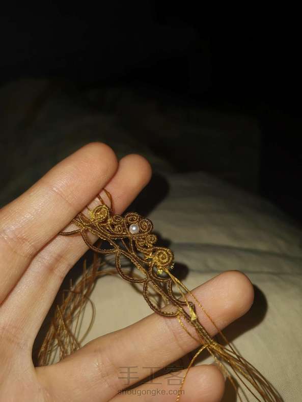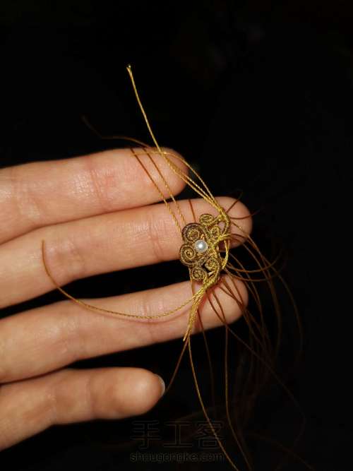 在轴上雀头结对折加一根线,两根线尾过后都要用。是用于之后承接螺旋卷用的,如果怕承接不牢固,可以再多加一根线,四个线头。